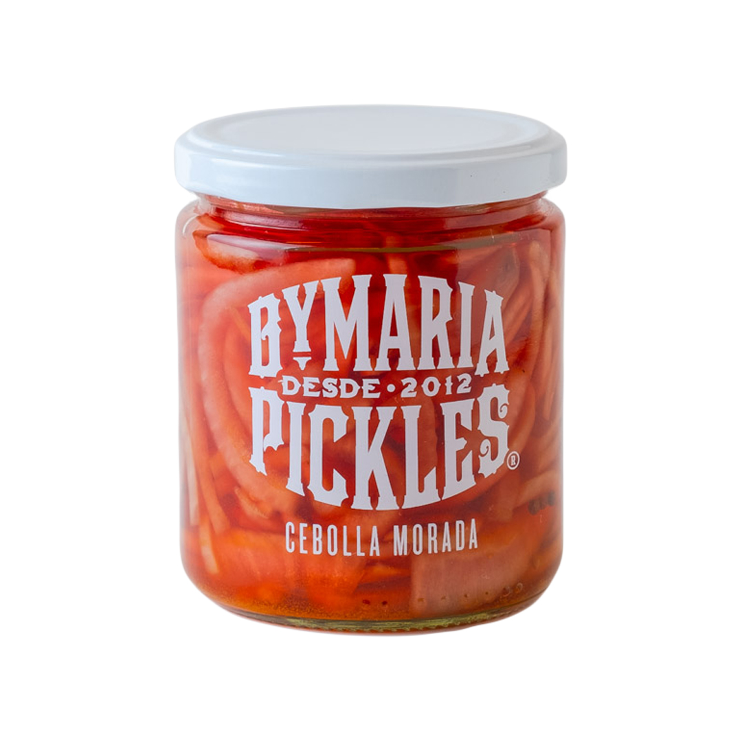 Cebolla morada cortada en aros encurtida en vinagre de Manzana, especias y un poco de jengibre.